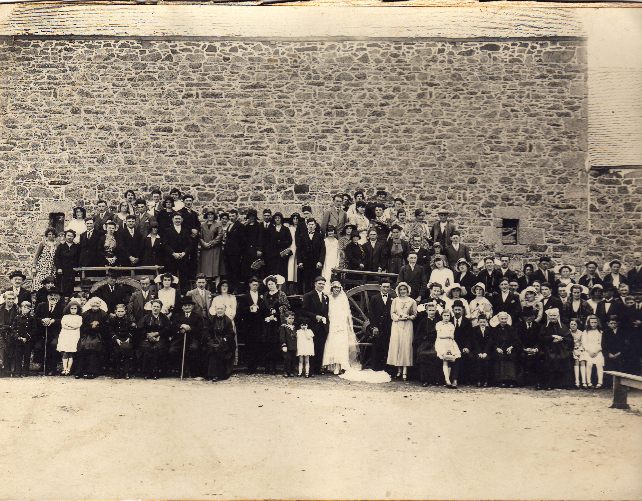 | __ Mariage le 20 Juillet 1931 de Jean pierre Le Page ( frère de mon GP maternel) et Marie Guillouët tous les deux du Merzer.( couple à droite sur la photo),il me reste à identifier le couple de mariés à gauche,sûrement de la famille de Marie Guillouët. Mes AGP maternels Jean François Le Page et Marie Harscöet sont assis au premier rang,à l’extrême droite,à côté des trois jeunes enfants. |