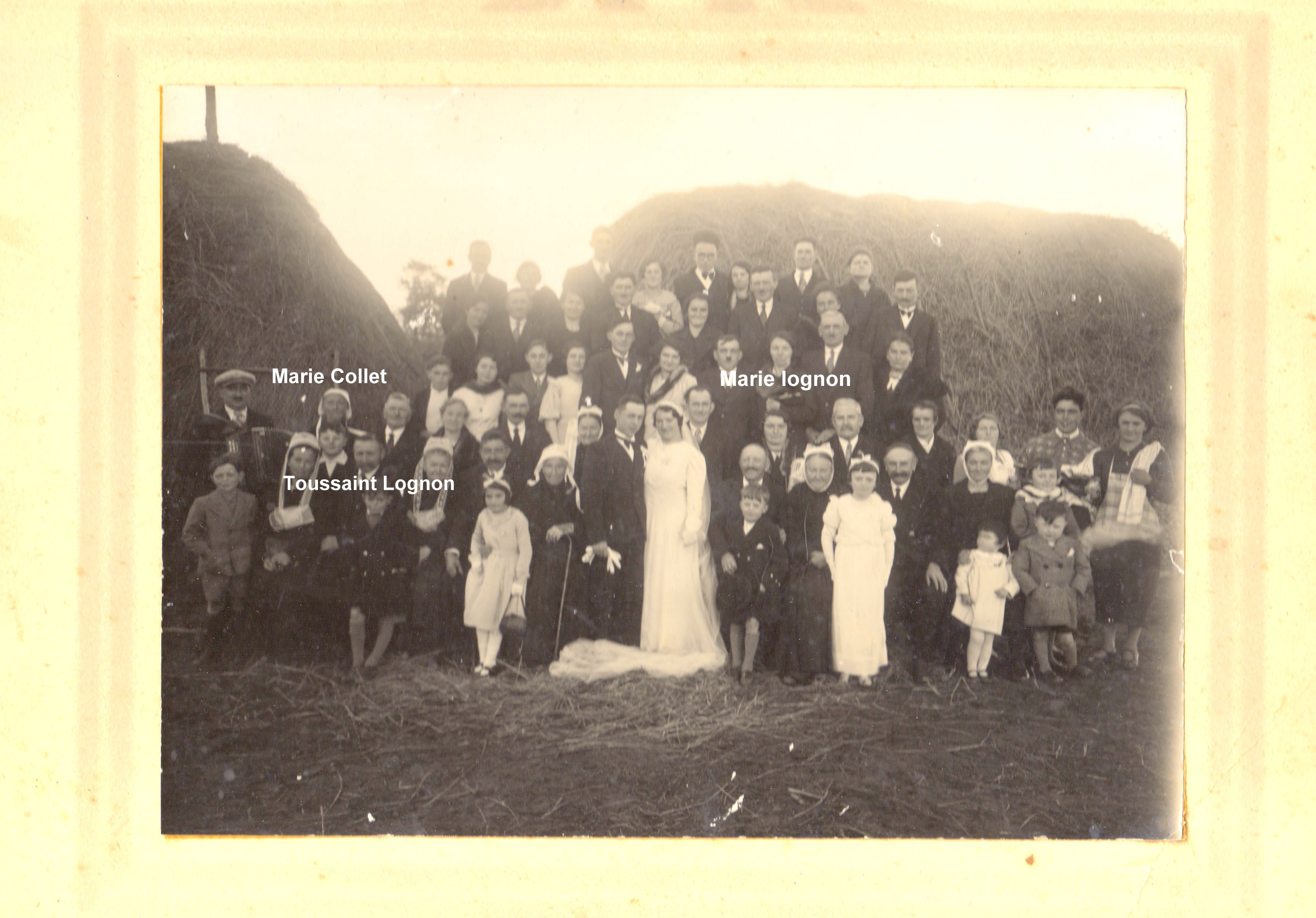 | __Mariage à la « ville pied » en Plélo le 6/11/1936 de Yves Marie Isidore Lognon filleul de ma GM maternelle et de Louise Françoise Meuro née à Groslay (S&O).Sur cette photo apparaissent Marie Lognon ma grand-mère maternelle,Marie Collet et Toussaint Lognon,mesAGP maternels. |